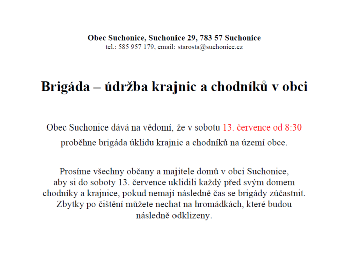 Obec Suchonice dává na vědomí, že v sobotu 13. července od 8:30 proběhne brigáda úklidu krajnic a chodníků na území obce.