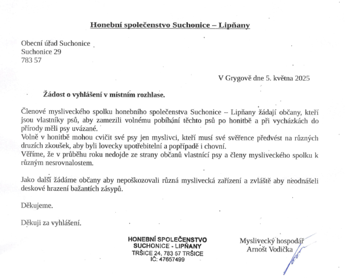 dnes nám byla doručena žádost Honebního společenstva Suchonice - Lipňany.