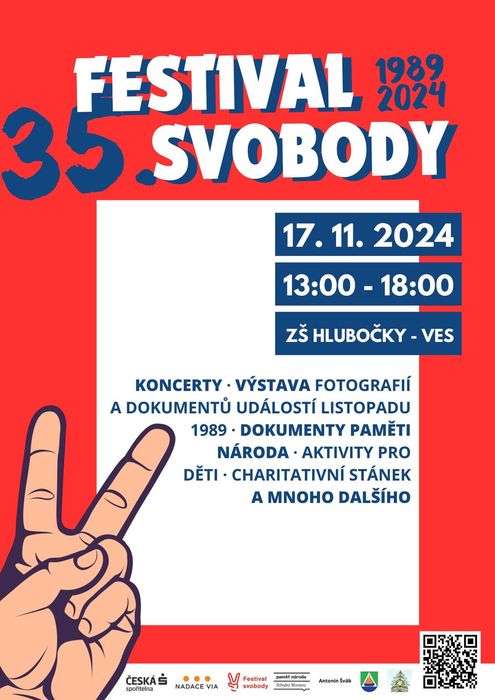 Pořadatelé Festivalu svobody vás srdečně zvou na akci k 35. výročí sametové revoluce, která se uskuteční v neděli 17. listopadu 2024 od 13:00 do 18:00 v budově ZŠ Hlubočky - Ves.